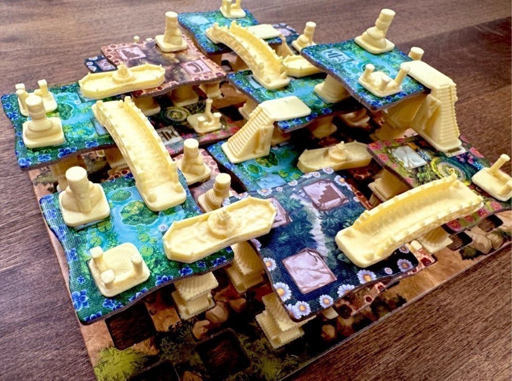 手番ごとに数個獲得できる柱を使い、自分の個人ボードに立体的に組み上げていきます。