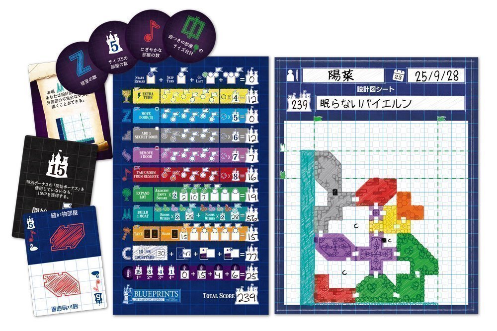 各ラウンドでは、部屋カードを1枚選んで、半透明なべラム紙製の設計図シートにトレースし、城の設計図を作図します。
