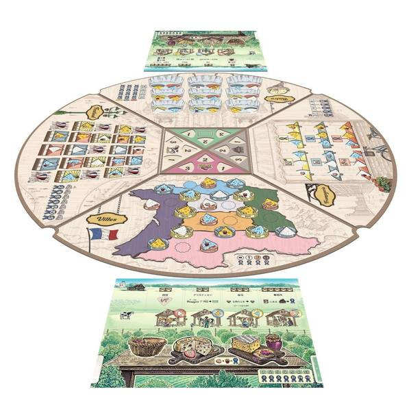 スペースにチーズトークンを配置し、分割ボードごとに異なる条件で勝利点を獲得