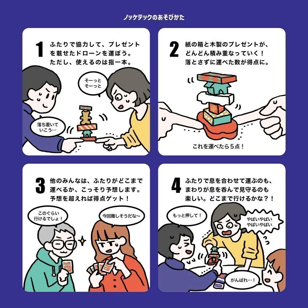 「ノッケテック」は、二人で協力して、プレゼントが積まれたドローンを運んでいくバランスゲーム。